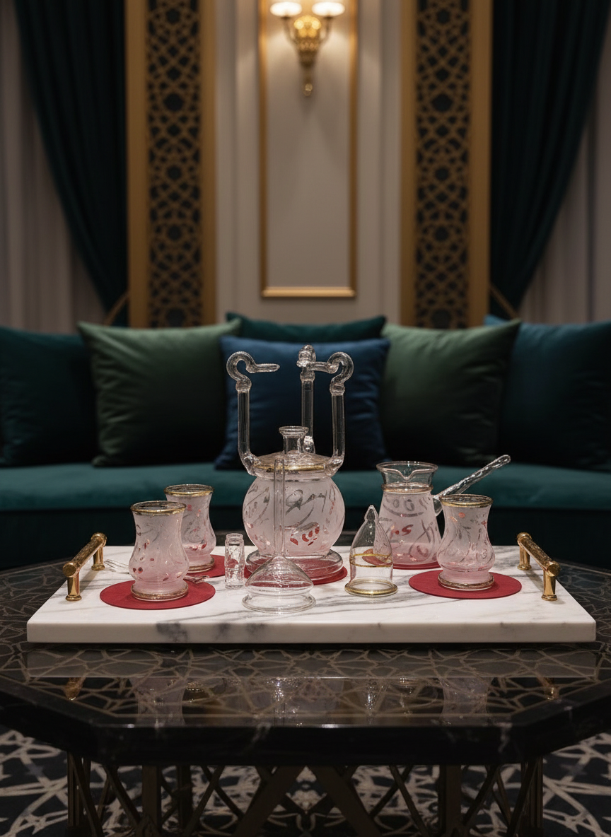 Create a luxurious serving ritual with this 9 piece hand decorated glass set featuring delicate floral etching and gold rim accents; crafted from heat resistant glass to handle hot Arabic coffee and tea with elegance. The coordinated pieces include a central pot, two brewing servers, two traditional tea/coffee cups, two mini bell covers, a stirring spoon, and a replacement wick accessory to complete the tabletop experience. Clear bodies showcase beverage colour while the gold detailing elevates presentations for Ramadan evenings, family gatherings and special guests. Lightweight yet durable for repeated use with easy hand wash care to preserve the artwork. A refined gift for new homes and café corners.